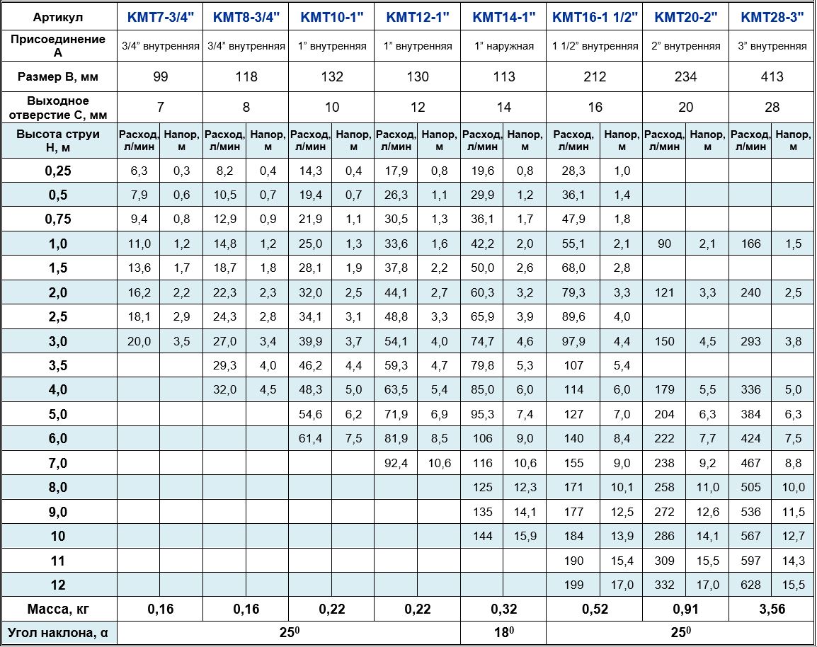 Серия фонтанных насадок «Комета» является одной из самых популярных, применяемых на сегодняшний день в фонтаностроении. Насадки оснащены внутренним делителем потока воды, который обеспечивает подъём водных струй на высоту, согласно данным, которые приведены в таблице гидравлических характеристик. Фонтанные насадки «Комета» имеют шаровое соединение, при котором угол наклона может достигать 20 градусов, что позволяет создавать параболическое направление струй воды без каких-либо дополнительных деталей и затрат. Насадка оснащена усиленной шестигранной муфтой для надежной фиксации угла наклона.