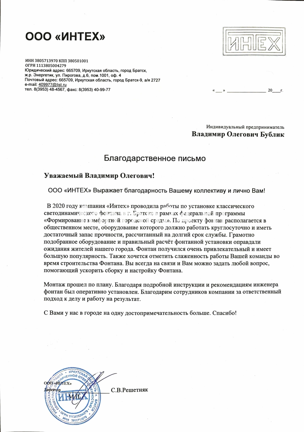 В 2020 году компания «Интех» проводила работы по установке классического светодинамического фонтана в г. Братске в рамках федеральной программы «Формирование комфортной городской среды». Так как по проекту фонтан располагался в общественном месте, оборудование должно было быть рассчитано на долгий срок службы и интенсивные нагрузки. Поэтому фонтанное оборудование мы закупили у ИП Бублик В.О. (ТМ «Фабрика Фонтанов»), который специализируется на изготовлении фонтанов для благоустройства. Инженер-гидравлик грамотно подобрал комплектующие с учетом особенностей проекта. Правильно были рассчитаны диаметры коллекторов, производительность сухих насосов, в итоге водная картина соответствовала проекту. Менеджер «Фабрики Фонтанов» постоянно консультировал нас, так как строительство чаши велось полным ходом. Во время были поставлены закладные элементы и запорная арматура. Монтаж прошел по плану. Благодаря подробной инструкции и рекомендациям инженера фонтан был оперативно установлен. Благодарим сотрудников компании за ответственный подход к делу и работу на результат.